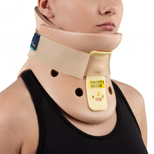 Dwuczęściowy kołnierz ortopedyczny twardy typu PHILADELPHIA wykonany z pianki polietylenowej wyprofilowanej anatomicznie z wzmocnieniami wykonanymi z PCV.