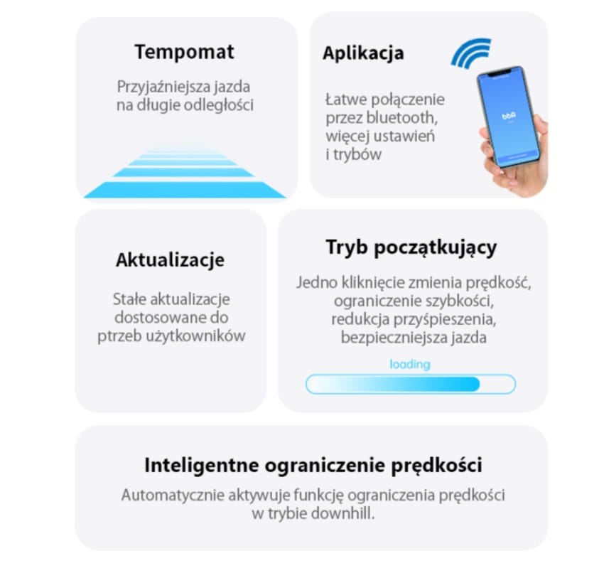 - Akumulator: wysokiej jakości bateria litowa z inteligentnym systemem BMS